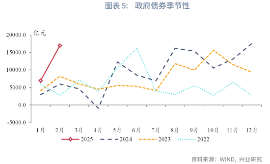 从分项上来看,新增人民币贷款方面,2月新增信贷规模同比少增,其中票据融资同比多增,存在票据冲量现象,融资需求较弱。政府债券方面,2025年开年以来,地方政府特殊再融资债发行速度较快,2025年2月政府债券录得16967亿元,当月政府债规模同比大幅多增10956亿元,融资节奏明显快于2024年同期。直接融资方面,2月企业债券、非金融企业股票融资规模分别录得1702亿元、76亿元,同比分别变化279亿元、-38亿元。