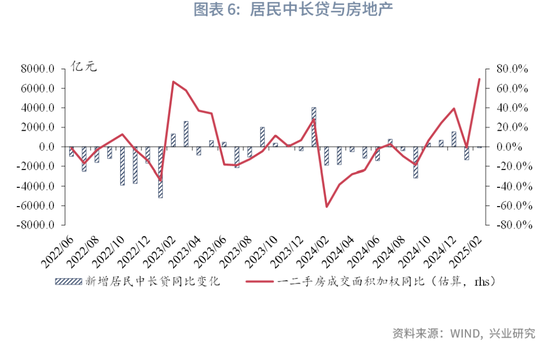 从居民贷款来看,2月新增居民短贷实现同比多增,居民中长贷同比小幅少增。具体来看,新增居民短期、中长期贷款分别为-2741亿元、-1150亿元,同比分别变化2127亿元、-112亿元。春节假期错位影响下,2月,我们估算的一、二手房成交面积同比录得69.5%,较上月上行70.3个百分点。尽管2月房地产交易韧性较强,居民中长贷的同比少增可能反映了居民提前还贷意愿依然较高。