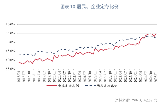 M1方面,2025年2月M1录得0.1%,较上月下行0.3个百分点。假如剔除春节假期错位影响,我们观察春节在1月的年份M1的环比表现,可以发现2025年2月M1整体弱于季节性增长。值得注意的是,2月居民较上月持平、企业存款增速小幅改善,2月M1增速回落可能反映了实体部门定存比例有所上行。