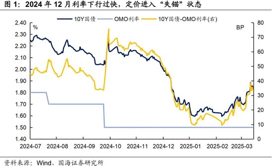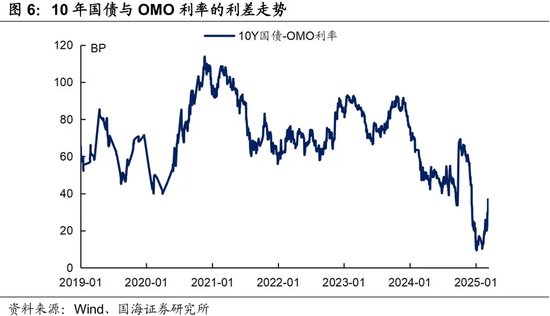 2024年12月政治局会议后,利率定价进入“失锚”状态。2024年12月9日政治局会议召开,盘后发布的会议公告中关于货币政策的表述,由之前“稳健的货币政策”变为“适度宽松的货币政策”,表态更为积极。市场对此反映强烈,利率抢跑、下行速度加快,其定价也进入“失锚”状态,10年期国债与OMO利率的利差一度收窄到10BP以内。