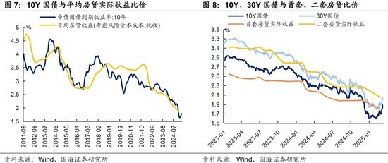从信贷比价的角度看,10Y和30Y国债收益率与房贷实际收益强相关。对于商业银行自营而言,贷款与中长利率债是可相互替代的资产,两者收益的联动性高。2023年以来,10Y国债收益率整体在首套、二套房贷的实际收益之间波动,30Y国债则围绕二套房贷的实际收益上下波动。