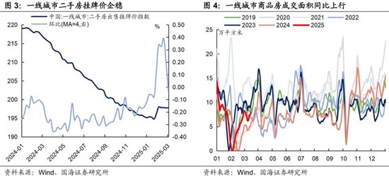 今年以来,地产市场有所回暖,但出现明显分化。一线城市成交面积同比上行,同时价格也出现企稳信号,2025年2月以来,一线城市的二手房挂牌价指数有所上涨。二三线城市的房价则仍在下跌。实际上,一线城市的地产市场需求较强,降息对其提振作用较为明显,而二三线城市地产市场走弱,后续或可通过收储等政策应对。因此,在一线城市地产逐步企稳的当下,降息的必要性下降。
