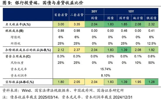 2024年12月长端利率下行斜率加大,10Y和30Y国债收益率向下突破与房贷收益的合理比价区间,近期在调整行情下,截至3月14日,10Y国债收益率为1.83%,略高于首套房贷实际收益;30Y国债收益率为2.04%,与二套房贷实际收益基本持平,经调整之后,长端利率与信贷比价回归到合理区间。
