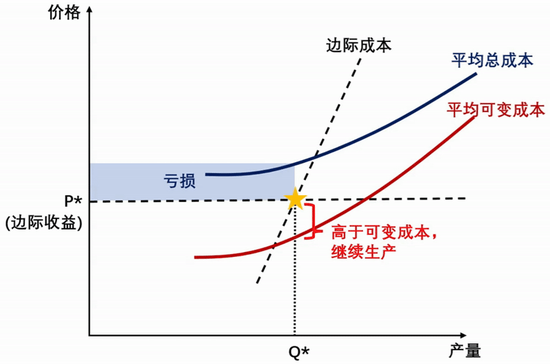 价格是市场经济中很重要的信号,企业看到价格上升才会生产或扩大生产。那么为什么有企业愿意“以价换量”,降价也要生产呢?微观经济学中有个和宏观领域相似的场景:面对产品售价持续走低,企业非但不缩减生产,反而选择“逆周期扩产”。这种看似矛盾的行为背后,暗含精密的成本核算逻辑。根据微观经济学原理,正如图3所示,当商品售价仍然高于可变成本时,即便无法覆盖固定成本,企业仍会选择继续生产。一些很“卷”的企业甚至会一边降价,一边扩大生产。此时企业的经营目标已不是“利润最大化”,而是“亏损最小化”。