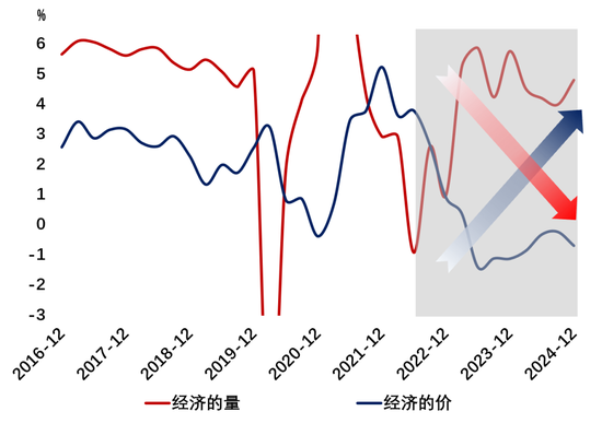 值得注意的是,在既往增长周期中,当实际GDP增速达到预期目标时,价格指数往往也会同步回升,企业利润也会持续改善。今天这种GDP增速与物价水平背离的现象少见,它因何产生?中央近期为何将“推动价格温和回升”纳入未来政策目标?