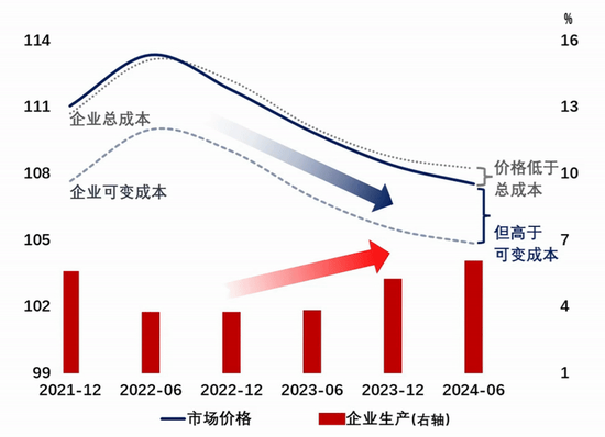 这一微观经济学中的概念与宏观上的量价背离存在一定的关联。我们统计了一些上市企业的状况,图4中蓝色实线代表市场的价格或者是产品售价。图4中的市场价格曲线已普遍穿透上市企业总成本线,但仍高于可变成本线。在这样的情况下,企业仍然会选择生产,这也从一个侧面印证了“量价背离”“亏损生产”的情况在现实经济中存在。
