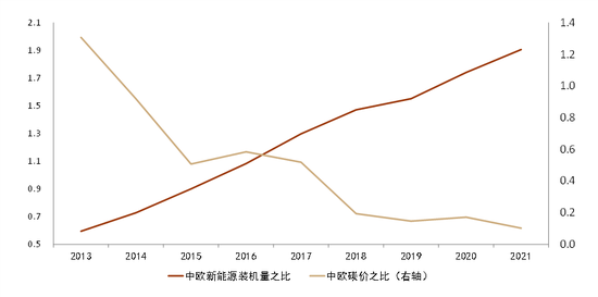 注:中国碳市场价格使用的是全国与区域碳市场的平均价格;新能源为风电和光伏累计装机量之和