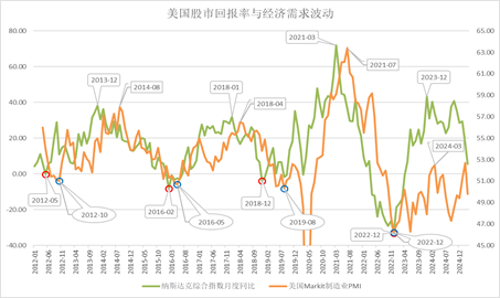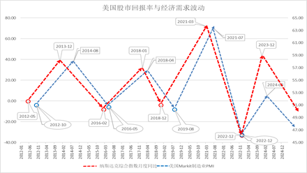 把纳斯达克股指一年期收益率和美国Markit制造业PMI这两个经济金融指标的走势叠放在一块比较,就会发现非常有趣的现象: