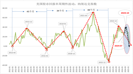 在最近的这轮周期中,美国纳指股市收益率在2023年12月达到峰值,然后转为趋势下行。但是,在2024年7月份之后出现了强劲的掉头回升,一度引发对周期下行的怀疑,毕竟此轮经济周期过程具有非典型特征(参见《美国正遭遇一次非典型经济短周期》)。