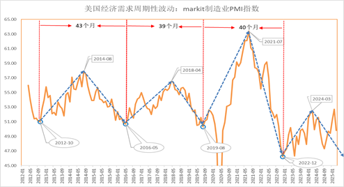 不过,资本市场最终回归了理性定价。特朗普作为商人政治家,他的政策不仅具有高度的任性、不确定性,贸易保护主义政策主张还具有强烈的收缩性色彩。股市一年期收益率在2024年11月份开始掉头。紧随股市,经济指标也重拾下行,纷纷回头,比如,美国ISM制造业新订单指数已连续两月跌落在荣枯线以下,从2025年1月的55.1%掉头下降到3月的45.2%;又比如美国Markit制造业PMI在今年3月份翻转下跌至49.8%,重回荣枯线以下。股市与经济双双再次下行,确认了经济在走下坡路,处在周期下行的衰退通道中。