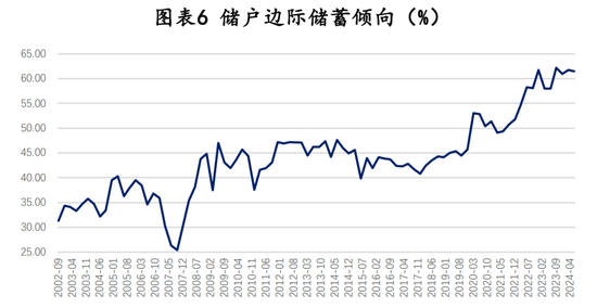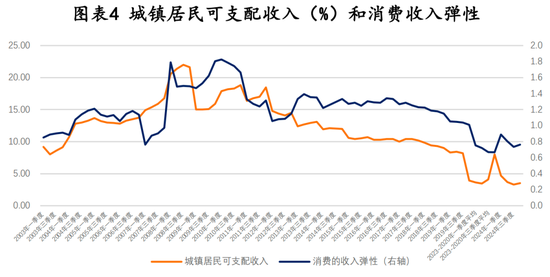 最终消费分为政府消费和居民消费,其中居民消费占70%左右,居民消费的变动决定了最终消费。而居民消费增长与城镇居民可支配收入增长之间存在较强线性关系,城镇居民可支配收入大约可以解释70%左右的居民消费支出。因此理论上,2024年4.6%的可支配收入增长应该带来5.4%的居民消费增长,匹配大约5.4%左右的最终消费,但如前所述,由于财富效应和预期因素双重影响,边际消费倾向减弱,最终消费增速只有3.3%。
