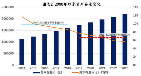 说明:资本存量的计算采用毕吉耀等(2013)书中第四章的数据和永续盘存法计算方式,以2000年为基期的不变价格计。由于统计局在2020年后停止公布固定资产投资价格指数,其后数据用PPI替代。折旧率δ取9.6%。