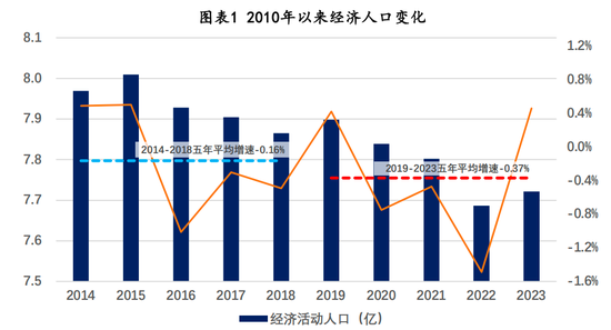 因此,我们并不打算计算经济潜在增速的具体数字,而是提出一个思路:以可获得数据的2023年作为分析点,向前倒推10年,并分为两个五年区间,分析2019年-2023年相对于2014年-2018年由于全要素生产率、资本存量和劳动力变化所导致的经济潜在增速的变化。如果不存在总需求不足问题,两个阶段的经济平均增速的变化应该与产出方程各要素变化导致的经济增速变化一致。如果后一阶段经济增速出现更快下滑,无论前面是否存在总需求不足,那么后一阶段就是总需求不足。