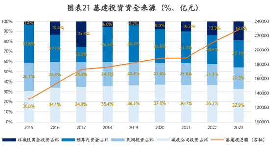 备注:城投自行筹资承担的基建投资额估算为:道路运输业、生态保护和环境治理业、公共设施管理业的投资总额扣除来自预算内资金(包括国家政府性基金支出的高等级公路车辆通行附加费、城市基础设施配套费和污水处理费,一般公共预算的交通运输费用和节能环保项目费用)和民间投资(包括民间固定资产投资的道路运输业和公共设施管理业)的部分。