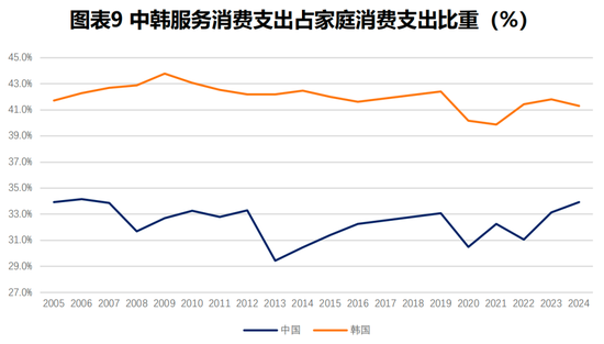如果进一步分析二者差异产生的原因,并非收入分配的差异,而是消费构成。在收入分配方面,中韩两国劳动报酬在GDP中的比重相差并不大,甚至我国还略高于韩国。例如2022年,韩国劳动报酬占国民可支配收入的比重是46.9%,而我国则是52.8%。在家庭消费支出构成中,韩国服务性消费支出占家庭消费支出比重较我国高了大约10个百分点。考虑到两国服务业价格的差异,如果折算成实物消费,两国差异并不大。
