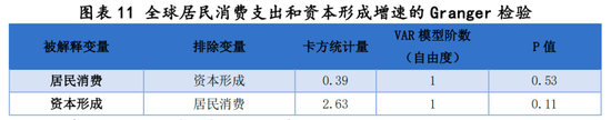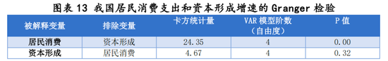 在此基础上,我们对变量做Granger因果分析,原假设为变量之间不存在因果关系。居民消费同比增速作为被解释变量时,卡方统计量约24.35,模型P值为0.00,可在1%显著水平上拒绝原假设,即资本形成总额同比增速是居民消费同比增速的Granger原因,即当前的资本形成增速可以解释未来一段时期的居民消费增速。