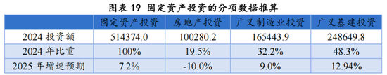 理论上,资本形成总额等于固定资产投资加上存货减去土地购置费。理想状态下,资本形成与调整后的固定资产投资应存在长期均衡关系。然而,由于2018年之前,部分地区固定资产投资数据存在虚报现象,导致二者关系失衡。国家统计局调整固定资产投资的计算方式后,二者之间的均衡关系得以恢复。从2019年至2024年,刨除2021年由于疫情导致的奇异点之后,固定资产投资平均较资本形成低0.44个百分点。如果要达到7.64%的资本形成增速,那么2025年固定资产投资增速需要达到7.2%。
