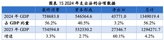 截至目前,国家统计局提供了2024年支出法核算的最终消费、资本形成和净出口对GDP的拉动率,但未提供实际数值,需要进行倒算。根据2024年生产法核算的GDP名义增速,将2024年最终消费、资本形成和净出口对GDP的拉动率折算成名义值,在此基础上计算出2024年最终消费、资本形成和净出口的名义值。将推算得到的数据加总,得到支出法GDP的总额是1349019亿元人民币,与统计局在2025年1月份发布的GDP数据相差64亿,几乎可以忽略不计。这也从侧面验证了推算方法的相对可靠。