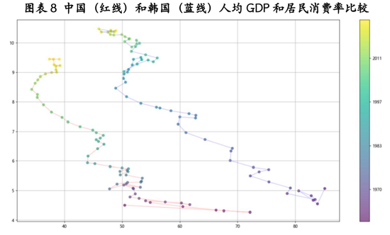 比较同样作为东亚国家的中日韩,日本的居民消费率随着收入的增加而增加,韩国则与我国比较类似,随着收入水平的增加,居民消费率呈现下降趋势。与韩国相比,在收入达到同一水平时,我国的居民消费率也低于韩国,差距大概在10个百分点左右。