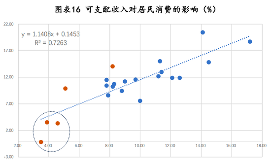 与之相对应,以资本形成总额同比增速为被解释变量,检验结果卡方统计量约4.67,P值约0.32,不能拒绝原假设,即当前居民消费增速不能解释未来资本形成增长。进一步对1998年以来投资和居民消费的数据做一个二项式回归,一次项为正但二次项为负,这说明越是在居民消费低迷的时候,投资对居民消费的拉动作用越明显。当前阶段,扩大投资对于居民消费的促进作用更为明显。