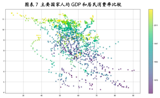 从主要国家人均GDP和居民消费率比较看,1980年代以前,随着人均GDP增长,居民消费率反而下降,可能的一个解释是,这段时期主要国家包括现在的发达经济体经济都处于高速增长阶段,人均GDP越高,需要的资本积累越高,随着经济增长,消费率也下降。