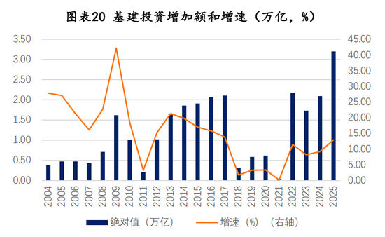 2025年基建投资增速如果达到12.94%,将成为2017年以来的最高增速。从绝对规模看,这对应新增基建投资规模3.2万亿元,也可能是历史上年度新增基建投资金额首次超过3万亿元,将较2024年多增1.1万亿。