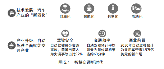 作为汽车行业革命的关键技术,自动驾驶将从安全、效率及商业模式等多方面赋能交通产业升级。总体来说,自动驾驶的优势一是安全高效,二是节能环保,三是能创造巨大的产业机遇。智慧交通新时代如图5.1所示。