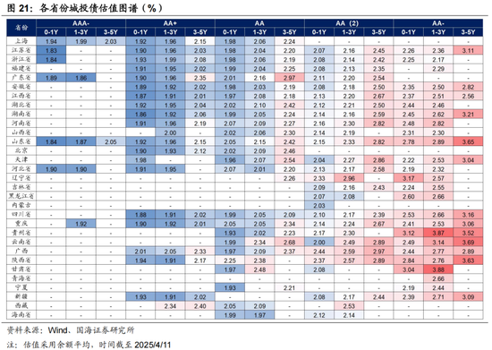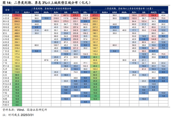 短端票息策略仍可延续,债市波动较大,信用债票息优势依然显著,关注一级市场短端高票息机会,重点可关注城投债,其中山东、重庆、陕西、江苏、四川二季度到期高估值城投债规模较大;地市方面,可结合风险偏好关注南京、苏州、常州、青岛、黄石、西安等二季度隐含AA(2)、AA-高票息城投债到期量较大区域。