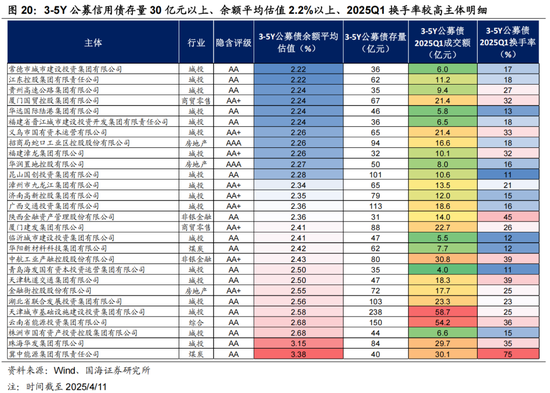 另外建议底仓增配3-5Y高估值、高流动性信用债,筛选标准为隐含评级AA及以上,3-5Y存量信用债规模30亿元以上,3-5Y余额平均估值2.2%以上,2025Q1换手率10%以上,共计28个主体,分布在城投、房地产、非银金融、商贸零售、煤炭等行业,建议可重点围绕隐含评级AA+及以上主体挖掘投资机会,如厦门国贸、义乌国资、广西交投、济南高新等主体。