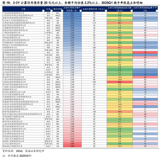 二季度建议可适度拉长信用债参与期限,短期重点可关注2-3Y高估值、高流动性信用债,通过对2-3Y存量公募债20亿元以上,2-3Y存量公募债券余额平均收益率2.2%以上,2025Q1换手率10%以上信用债主体梳理,2-3Y高估值、高流动性信用债主要分布在城投、房地产,交通运输、公用事业、钢铁也有部分满足条件主体,可重点关注天津城建、河南航空港集团、珠海华发集团、河钢集团等成交额较大主体。