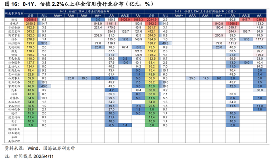 配置盘仍可关注短端高估值信用债,我们以剩余行权期限0-1Y,行权估值在2.3%以上非金信用债为短端高估值非金信用债统计口径。按照行业划分,从绝对规模来看,短端高估值非金信用债主要集中在城投、房地产,其中短端高估值城投债主要集中在AA(2)、AA-评级,房地产债则主要集中在AA评级。从相对占比来看,纺织服饰、电力设备、家用电器、房地产短端高估值信用债占存量比较大。