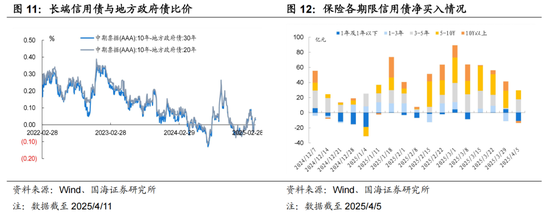 对于负债端稳定的配置机构可进一步关注长端信用债,长端信用债经历年初至2025/3/10的调整后,相较于长端地方政府债优势已并不明显,但近期债市边际修复,地方政府债跟随修复,但是长端信用债估值修复整体有限,长端信用债与地方政府债品种利差再次走阔,同时叠加潜在的资本利得机会,负债稳定的机构仍可增量关注长端信用债。