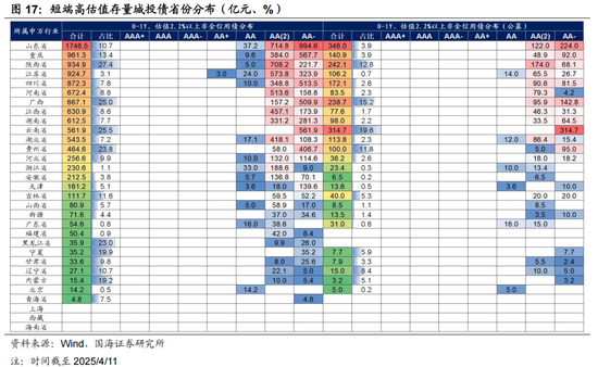 省份维度,从绝对规模来看,短端高估值城投债主要集中在山东、重庆、陕西、江苏、四川等省份,具体到短端高估值公募城投债方面,山东、陕西、广西、云南、四川存量规模相对较大。从相对规模来看,其中陕西、广西、云南、贵州短端高估值公募城投债占公募城投债存量比重较大。