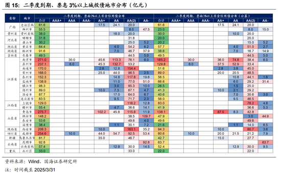 具体到城投债,按照省份来看,2025年二季度高票息公募城投债到期量主要集中在江苏省、山东省,分别为872.2亿元、446.9亿元,另外浙江、湖南、湖北、江西、四川等区域二季度公募城投债也有一定到期规模,普遍在200-300亿元。