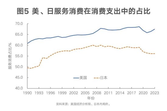 服务消费占比提升已成为全球经济发展的趋势,这一现象在美日等发达国家表现得尤为明显。目前我国服务消费占居民消费支出的比重仅52.3%(2022年),与美国、日本等国家相比还有较大差距。在美国,服务占居民消费支出的比重从1990年的60.8%上升至疫情前的68.6%(2019年),而同期商品消费支出(包含耐用品和非耐用品)占比不断减小。日本也呈现类似趋势,服务占居民消费支出的比重从1990年的49.5%上升至2019年的59.0%,商品消费支出占比则相应下降。2020年至2022年,疫情对实体消费场景造成了显著冲击。由于服务消费高度依赖实体场景,这一时期服务消费占比出现了明显波动。总体来看,消费结构正在从商品消费逐步转向服务消费,这一变化反映了消费升级的普遍规律。