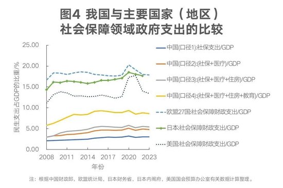 截至2023年末,我国社保支出仅占GDP的3.1%(如图4中口径1),加上医疗方面的开支后(口径2)达到4.8%,社保、医疗、住房保障性支出合计(口径3)占GDP的5.5%。教育支出在严格意义上并不属于社保范畴,主要国家的社保支出中也并未纳入这一项,因此上述口径3应当作为我国与其他主要国家比较的基准。而即使以最宽口径来衡量(将我国社保、医疗、住房和教育方面的政府支出加总,即口径4),我国民生领域的政府支出也还有比较大的提升空间。