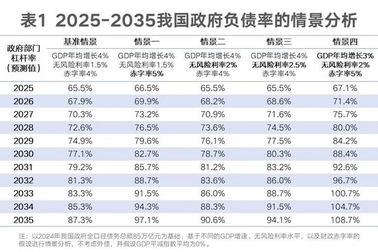 在基准情景的基础上,如果进一步加大积极的财政政策力度,将赤字率提升至每年5%(见表1中的“情景一”),到2035年,我国政府部门债务仍可控制在当年GDP总量的100%以内。