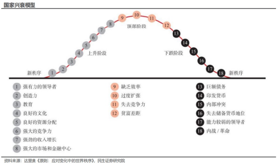 以达利奥《原则》一书中的国家兴衰模型来看,特朗普领导下的美国则正在经历着上述兴衰模型从顶部阶段到下跌阶段的过程。