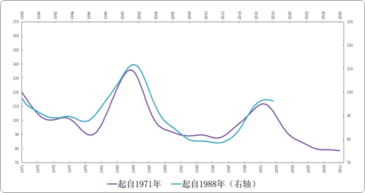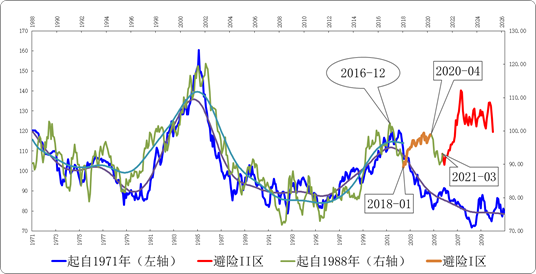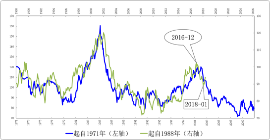 下面这个图是根据美元指数的原始数据绘就的,它把时间轴折了一下,把起自1971年的美元指数走势和起自1988年的美元指数走势放在同一个时间起点上,这样处理后可以发现美元指数的走势自相似性非常强。