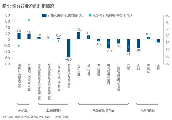 分行业看,供需失衡问题主要集中在制造业中下游行业。国家统计局公布的13个制造业大类行业中,7个行业存在产能利用不足情况,其2024年产能利用率显著低于2016年以来的历史平均水平。其中,6个行业位于制造业中下游,占比85.7%(如图1所示)。汽车制造、电气机械、计算机电子等中游装备及资本品制造业产能利用不足的问题突出,产能利用率分别较历史均值低4.0个、2.9个和1.3个百分点。食品、生物医药等下游消费品制造业产能利用率较历史均值低2.8和1.0个百分点。此外,需求高度依赖房地产部门的非金属矿物制品业供需失衡情况较为突出,2024年产能利用率仅为62.2%,较历史均值低5.9个百分点。