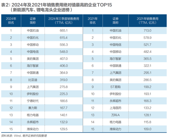 例如,汽车制造业近两年销售难易程度均值较历史平均水平下降1.1个百分点,说明销售难度明显提升,行业过度营销、内卷严重,陷入增收不增利的困境。同时,比亚迪、赛力斯等头部车企,因销售快速扩张,销售费用增长明显,已经进入2024年销售费用绝对规模排名前15的上市公司行列(见表2),而2021年销售费用排名前列的上市公司主要是垄断性企业和依赖渠道销售的家电企业。头部车企有毛利率保障尚且在疯狂“卷销售”,比亚迪销售费用率从2021年9%左右提升至14%左右,中腰部企业面临的竞争更加激烈。