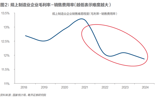 销售难易程度:整体看,2021年后中国制造业企业的销售难度不断加大,客观上导致了内卷现象。根据国家统计局发布的规模以上制造业企业经济效益指标计算,2024年制造业企业销售难易程度指标(1月-12月累计毛利率-销售费用率)为11.9%,显著低于2021年的13.2%,且较2018年以来历史均值12.5%低0.6个百分点(如图2所示)。这一指标越低,说明销售难度越大。