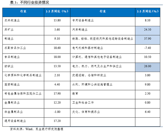 一季度,“两重”项目建设提速,“两新”政策加力推进,固定资产投资同比增长4.2%,较1-2月加快0.1个百分点。其中,第一产业投资增长16%,第二产业投资增长11.9%(采矿业5.6%、制造业9.1%、电热汽水28.9%),第三产业投资增长0.1%,基础设施建设投资增长9.19%。从细分行业来看,汽车制造、交通运输设备制造、电热气水生产和供应业维持20%以上较快增长。