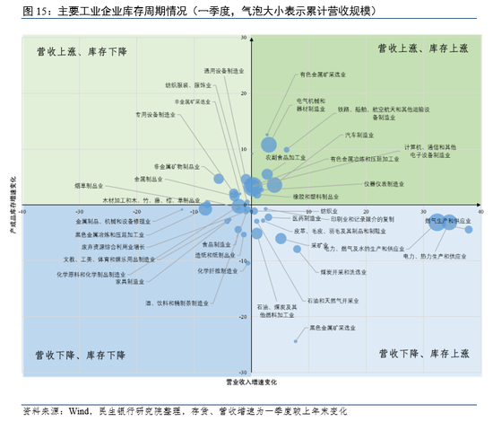 一季度,多数行业处于主动补库(11个)和被动补库(14个)阶段,库存增速环比回升,但前者营收增速环比回升,后者营收增速环比回落。