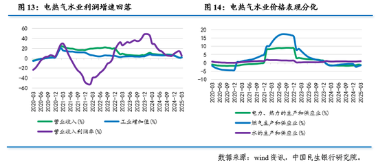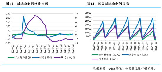 从制造业看,一季度生产加快,加之营业收入利润率同比增速由负转正(1.56%),带动利润增幅进一步走阔。上游原材料制造业利润增幅走阔,有色行业领涨,钢铁行业利润转正。中游装备制造业重要支撑持续增强,装备制造业拉动全部规上工业利润增长2.0个百分点,成为规上工业利润增长的重要支撑。下游消费品制造业利润出现分化,农副产品、纺织业、医药制造等行业利润增幅走阔。
