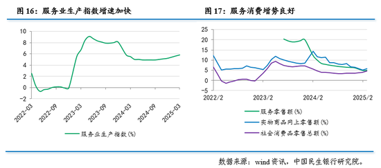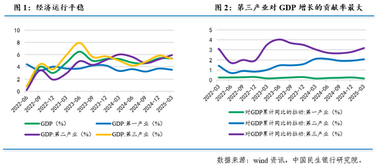 从产业角度来看,第三产业压舱石作用突出,一季度同比增长5.3%,较2024年全年加快0.3个百分点,是GDP增长提速的主动力。随着政策组合持续显效,服务业转型升级步伐加快,第三产业对GDP增长的贡献率为59.1%,拉动GDP增长3.2个百分点;服务业增加值占国内生产总值比重为61.2%,较2024年全年上升4.5个百分点。第一产业对经济增长的贡献率为2.6%,拉动GDP增长0.2个百分点;第二产业对经济增长的贡献率为38.3%,拉动GDP增长2个百分点。