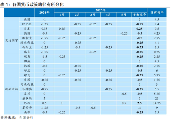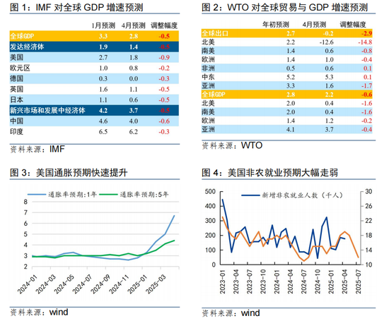 在特朗普高额关税和贸易摩擦加大下,全球出口增速和经济增长预期被大幅下调。4月,IMF将全球GDP增速预测值由3.3%下调至2.8%,WTO将全球GDP增速预测值由2.8%下调至2.2%。同时,WTO预计在贸易战冲击下2025年全球出口增速降下滑0.2%,大幅下调去年10月2.7%的增速预期。此外,关税推高全球衰退与通胀预期,经济走势不确定性加大,也使得各国央行决策难度加大,货币政策维持谨慎渐进态势,内部分歧加大。
