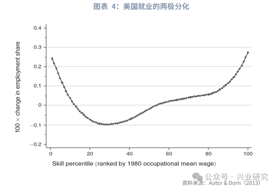 然而,全球化旧范式亦有不完美之处。对发达经济体而言,一是产业资本的流出与自动化一定程度上影响了中等技能群体的就业。在美国的经济研究中,一个经常被谈及的词语就是“Job Polarization”,即就业的两极分化。根据Autor & Dorn(2013),20世纪80年代后美国的就业出现了明显的分化,低技能与中高技能就业增长,但中等技能就业减少。对于就业的两极分化,学术研究提出了多种解释,其中之一是制造业就业机会的减少,使一些中等技能群体流向低技能的服务岗位。