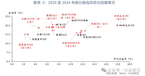 二是金融资本的流入使美国金融市场在全球表现出众。在股票市场,2020年至2024年间,海外主要股指的波动率大致处于相近的区间,其中美国股指的风险收益明显表现优于法国、德国等其他样本股指。在债券市场,东亚与中东产油国美元收入流向美国国债市场,压低了美国的国债利率。根据 Barsky & Easton(2021),1994年海外投资者持有的美债占比约20%,到2006年这一比例上升到50%左右,其背后的驱动力是积累了大量储蓄的海外经济体对安全资产的追求。据其估算,海外对安全资产的需求带动美债收益率下降了50bps。