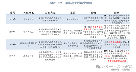 最后一个“1”代表一个新的货币环流。国际贸易问题与国际货币制度一体两面。美国每过几十年就会出现一次贸易保护主义抬头的现象。保护国内产业、改善国际收支、降低财政赤字是贸易保护主义不变的动机,而高关税政策的拐点通常都伴随着货币制度的根本性变化,如美元的大幅贬值,或黄金产量的显著增长。例如,1930年胡佛政府颁布了《斯姆特—霍利关税法案》,该法案使得美国应税产品的平均关税水平从1929年的40.1%最终上升至1932年的59.1%。罗斯福上台后,在1933年3月和1934年1月实施了《紧急银行法》和《黄金储备法》,逐步放弃了金本位制。1934年6月美国两院通过了《互惠贸易协定法》,对 1930 年关税法进行了修订,授权和外国政府或机构进行关税协定谈判,在不经过参议院批准的情况下,总统可以与外国政府签订贸易协定,对现行关税和其他限制贸易措施进行修改,但调整幅度上限为50%,同时遵循关税的无条件最惠国待遇原则。